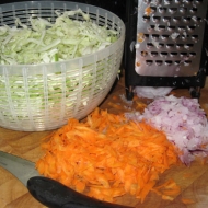 Hmm… cabbage is ready to harvest. What to make? I know… coleslaw! I love North Carolina Coleslaw, preferring the tangy kind over the creamy kind. Inspired by a recent trip to the Carolinas, I looked up this recipe on www.bonappetit.com. Out to the garden I went, to gather the cabbage, along with some fresh carrots