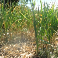 Does it seem a bit early to be harvesting garlic? After a mild Winter that ended early, this Spring allowed the garlic to start sending up scapes probably 6 weeks ago, leaves began turning yellow on top and dying back from the bottom – all signs that the garlic