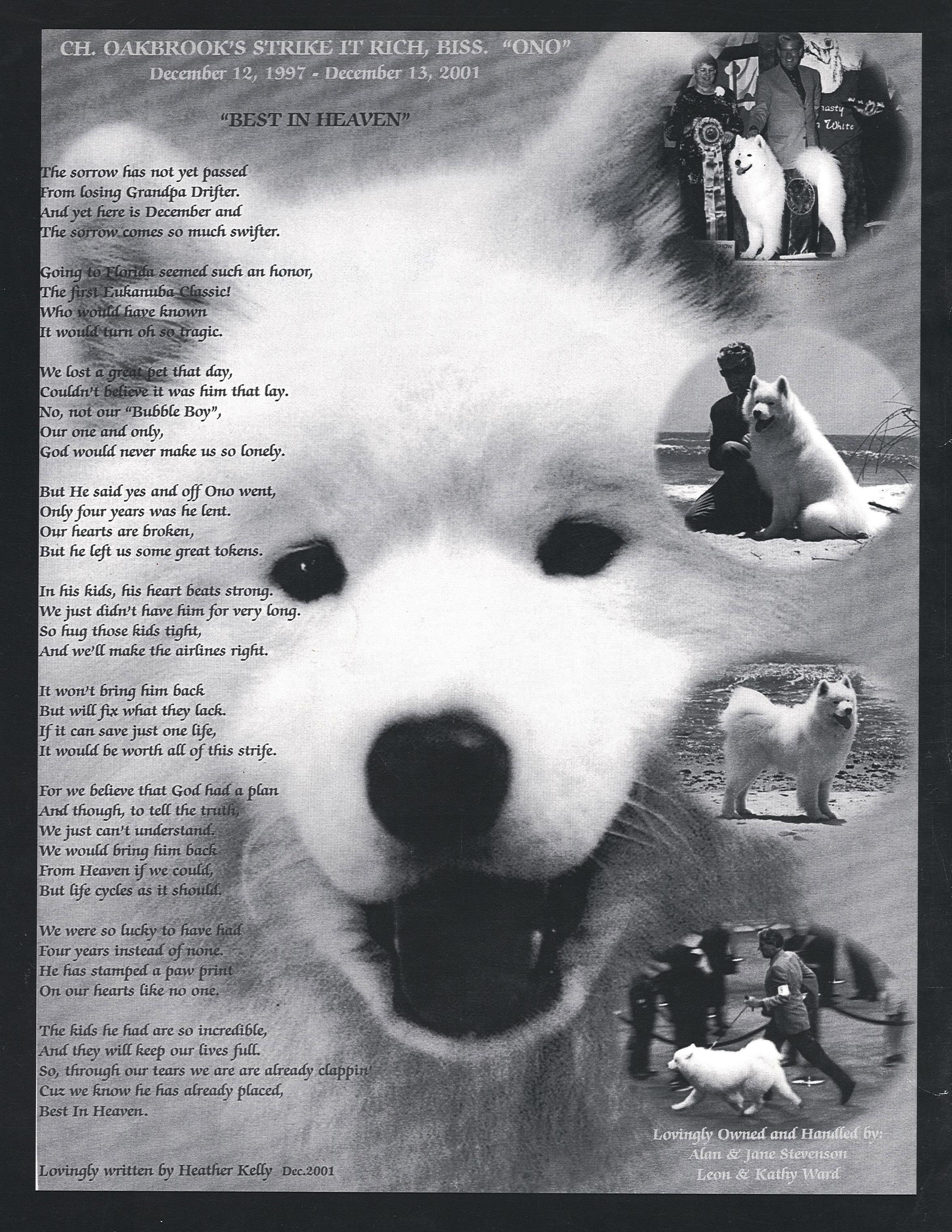 We have many “Ono” sons, daughters, grandchildren and now 6 or 7 generations that are being shown and doing wonderful things in the show ring. We are very proud of all that he has contributed to our wonderful breed and is greatly missed. We will never have another like him.